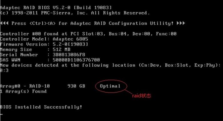 1.服务器开机自检后,下一步就会进入Raid卡自检过程,此时显示器上会出现Ctrl -A提示,如下图: